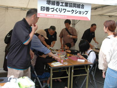 当組合は20日日曜日に、恒例となった大小路での「印香づくり体験ワークショップ」を開催いたしました。前日夜間の大雨も止んで、過ごし易い秋の気候となった事もあって、大変大勢の方が堺まつりに参加され、印香づくり体験も開催と同時に終日超満員となり100名近い方々が印香づくりを楽しまれました。